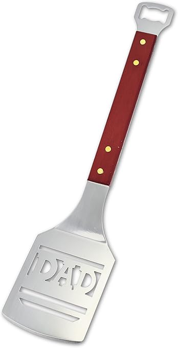 • מרית נהדרת רחבה ואיכותית עם ידית עץ והמילה DAD על משטח הנירוסטה הרחב שמאפשר להפוך כל המבורגר בקלות